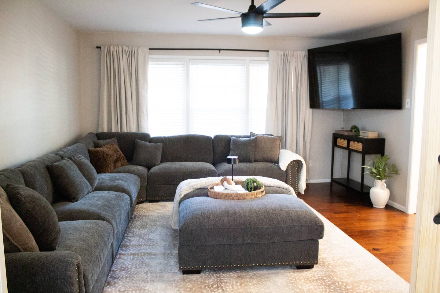 Spacious 4-bed, 2-bath Midland home with game room (Golden Tee, NFL Blitz), two 75” TVs, huge sectional lounge, and outdoor oasis with grill, shaded pergolas, and large hot tub. Centrally located near downtown, dining, and shopping—perfect for families, crews, or friends to relax, play, and unwind in style.